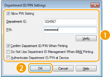 [Confirm Department ID/PIN When Printing] / [Confirm Department ID/PIN when Sending Fax] Поставете отметка, за да извеждате диалоговия екран [Confirm Department ID/PIN] всеки път, когато отпечатвате или изпращате факс чрез компютър.