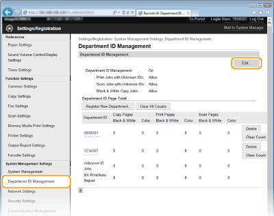 Щракнете върху [Department ID Management] и запаметете (или редактирайте) кодове на отдели.