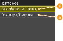 Когато е зададена настройка <Разсейване на грешка> за <Полутонове> (Полутонове), <Режим 1>, <Режим 2>, <Режим 3> и <Режим 4> прилагат същия ефект върху разпечатките, какъвто се прилага чрез <Режим 6>.