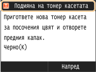 Не сменяйте тонер касетата, докато на сензорния дисплей не се изведе съобщение, което ви приканва да направите това.