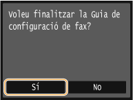 Si heu seleccionat anteriorment <Configurar més tard> a la pantalla de configuració de fax ( Registre del número de fax i el nom de la unitat), toqueu <Menú>  <Opcions de fax>  <Guia de configuració de fax> per visualitzar la pantalla de configuració de fax.