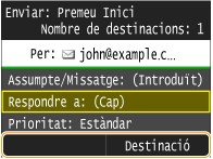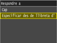 L'adreça de resposta no està establerta de manera predeterminada. Si voleu notificar el destinatari de l'adreça de resposta, especifiqueu l'adreça entre les que hi ha desades a la llibreta d'adreces. Si no hi ha cap destinació desada a la llibreta d'adreces, vegeu Desament de la llibreta d'adreces.