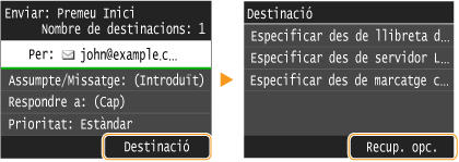 Podeu seleccionar una destinació entre les tres destinacions més utilitzades anteriorment. Quan especifiqueu una destinació utilitzada anteriorment, l'equip també estableix les mateixes opcions de lectura, com ara la densitat, utilitzades l'última vegada que vau enviar documents a aquella destinació.