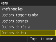 Es mostra una llista de totes les opcions de fax amb descripcions breus. Les opcions predeterminades estan marcades amb una daga (