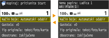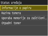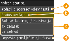 , prikazuje se zaslon koji omogućuje provjeru statusa dokumenata koji se ispisuju, šalju ili primaju te statusa uređaja, npr. razine tonera ili mrežnih postavki (IP adresa uređaja itd.).