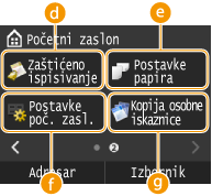 na upravljačkoj ploči. Gumbi za pristup funkcijama prikazuju se na početnom zaslonu. Radi jednostavnijeg korištenja gumbe na početnom zaslonu možete dodati/izbrisati i prerasporediti.