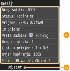 Prikazan je broj kopija, postavke i ostale pojedinosti. Ako želite samo provjeriti pojedinosti bez otkazivanja kopiranja, pritisnite
