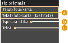 Možete odabrati optičku kvalitetu slike za kopiju u skladu s vrstom dokumenta, npr. za dokumente koji sadrže samo tekst, dokumente koje sadrže dijagrame i grafikone ili pak slike iz časopisa.