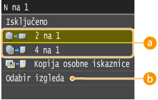 , no moguće je da se rubovi dokumenta neće kopirati ako ga povećate.<2 na 1>/<4 na 1> nije dostupno prilikom korištenja funkcija <Briši okvir> i <Kopija osobne iskaznice>.
