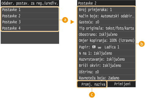 Možete registrirati do četiri često korištene kombinacije postavki kopiranja. Jednostavnim odabirom registrirane kombinacije postavki kada vam zatreba uklonit ćete potrebu za konfiguriranjem istih postavki pri svakom kopiranju: ako, primjerice, često kopirate dokumente u pet primjeraka, postavite <Briši okvir> na <Uključeno> i povećajte oštrinu kopiranja. Kombinacije postavki možete registrirati pod bilo kojim nazivom.