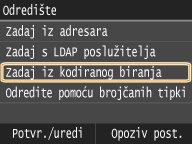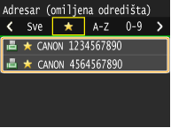 Adresar omogućuje definiranje odredišta odabirom s popisa registriranih odredišta ili pretraživanjem po imenu za odredišta s imenima primatelja. Odredište možete definirati i izravno tako da unesete troznamenkasti broj (broj za kodirano biranje) koji je dodijeljen odredištu.