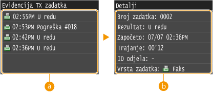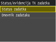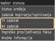 ![]() <Evidencija TX zadatka>/<Evidencija RX zadatka>Prikazuje popis primljenih i poslanih dokumenata. Ako je dokument uspješno poslan ili primljen, prikazuje se <U redu>, a ako se dokument nije uspio poslati ili primiti jer je poništen ili je došlo do pogreške, prikazuje se <Pogreška>.