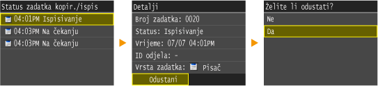 Otkazivanje iz sučelja Remote UI (Korisničko sučelje za daljinski pristup)Ispis možete otkazati sa stranice [Job Status] u sučelju Remote UI (Korisničko sučelje za daljinski pristup): Provjera trenutnog statusa dokumenata za ispis