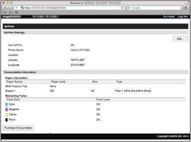 Podatke koji se koriste za prepoznavanje uređaja, uključujući naziv uređaja i mjesto instaliranja, možete registrirati. Možete i onemogućiti funkciju AirPrint na uređaju. Te postavke promijenite pomoću sučelja Remote UI (Korisničko sučelje za daljinski pristup).