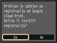 Uređaj možete registrirati i s mobilnog uređaja ili iz preglednika Google Chrome*. Na zaslonu uređaja prije dovršetka registracije prikazat će se zaslon za potvrdu u nastavku. Pritisnite <Da> da biste dovršili registraciju.