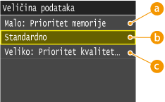 Skenirani se dokumenti pretvaraju u navedene formate zapisa datoteka. U tom trenutku možete odrediti omjer kompresije datoteke. <Malo: Prioritet memorije> povećava omjer kompresije u odnosu na uobičajeni radi stvaranja manjih datoteka s manjom kvalitetom slike. S druge strane, <Veliko: Prioritet kvalitete slike> smanjuje omjer kompresije u odnosu na uobičajeni radi stvaranja većih datoteka i veće kvalitete slike.