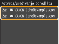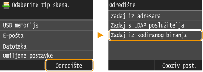 Adresar omogućuje definiranje odredišta odabirom s popisa registriranih odredišta ili pretraživanjem po imenu za odredišta s imenima primatelja. Odredište možete definirati i izravno tako da unesete troznamenkasti broj (broj za kodirano biranje) koji je dodijeljen odredištu.