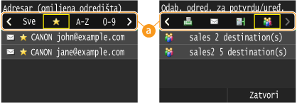 <Da>.Ako ste u drugom koraku definirali odredišta u grupnom biranju, na zaslonu se prikazuje "XX odredišta". Kada dodirnete tu stavku, prikazuju se odredišta registrirana u grupi.