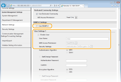 Potvrdite okvir [Enable User] i definirajte postavke [User Name], [MIB Access Permission] i [Security Settings].