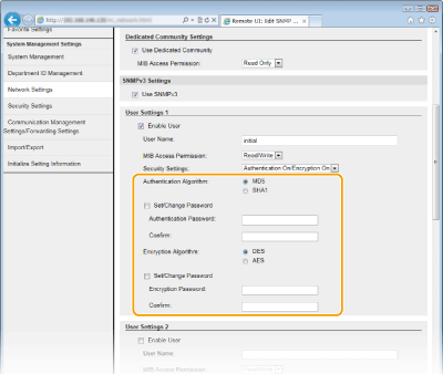 Da biste postavili ili promijenili lozinku, potvrdite okvir i unesite 6 do 16 alfanumeričkih znakova za lozinku u tekstni okvir [Authentication Password]/[Encryption Password]. Unesite istu lozinku u tekstni okvir [Confirm] da biste je potvrdili. Za algoritme provjere autentičnosti i šifriranja mogu se postaviti zasebne lozinke. |