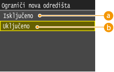 Ograničavanjem brojeva koje je moguće navesti prilikom slanja dokumenata na one koji su registrirani u adresaru, koje ste već koristili ili koje je moguće tražiti na LDAP poslužiteljima smanjujete mogućnost navođenja netočnih odredišta i korisnicima onemogućujete odavanje informacija. Kada je ta funkcija omogućena, uređaj korisnicima zabranjuje unos odredišta pomoću numeričkih tipki, dodavanje novih unosa u adresar te uređivanje postojećih unosa u adresaru.