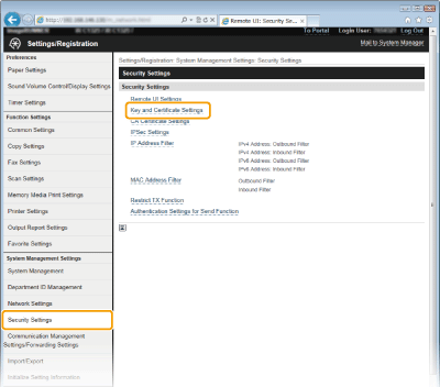 Kliknite [Security Settings] [Key and Certificate Settings].