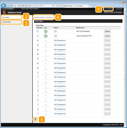 Prikazuje brojeve za kodirano biranje i popis favorita koji su registrirani u adresaru. Adresar možete registrirati ili uređivati i kada se prijavite u načinu rada za upravitelja sustava.