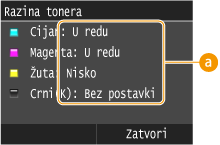 Na zaslonu se prikazuje boja tonera koji je potrebno zamijeniti. Ako je potrebno zamijeniti više spremnika s tonerom, zamijenite ih sljedećim redoslijedom: crna, žuta, magenta, cijan.
