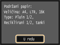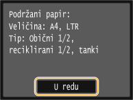 Provjerite je li u uređaj umetnut papir veličine i vrste prikazane na zaslonu, a zatim dodirnite <U redu>.