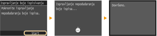 Korekcija boje ispisa odnosi se na pomak boja na ispisu koji se može dogoditi prilikom ispisa jedne slike upotrebom većeg broja spremnika tonera. Ispisi bi mogli biti mutni zbog nepodudaranja boja ispisa. Ako dođe do nepodudaranja u boji ispisa, izvršite sljedeći postupak. Ta se prilagodba ponekad provodi automatski, primjerice prilikom zamjene spremnika tonera.