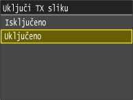 Kada odaberete <Uključeno> ili <Samo u slučaju pogreške> za <Izvješće o rezultatu TX-a faksa>, u izvješće možete uvrstiti dio faksa. Podesite <Uključi TX sliku> na <Uključeno>.
