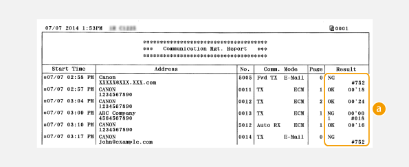 Kada se pojavi šifra pogreške). U slučaju e-pošte izvješća o upravljanju komunikacijom pokazuju rezultat prijenosa između uređaja i poslužitelja e-pošte, a ne između uređaja i adrese odredišta.