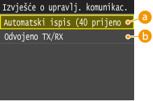 Odaberite <Uključeno> da biste izvješća o slanju i primanju ispisali zasebno ili <Isključeno> da biste ih ispisali na istom listu.