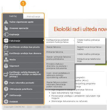 Sadrži tekstni okvir za pretraživanje i traženje željene stranice.