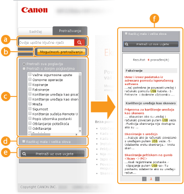Prikazuje rezultate pretraživanja stranica koje sadrže navedene ključne riječi. U rezultatima pronađite stranicu koju tražite i kliknite naslov s temom stranice. Ako rezultate nije moguće prikazati na jednoj stranici, kliknite