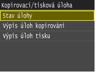 ![]() <Výpis úloh tisku>Zobrazí seznam vytištěných dokumentů. Pokud byl dokument vytištěn úspěšně, zobrazí se zpráva <OK>, pokud se dokument nepodařilo vytisknout, protože byl zrušen nebo došlo k chybě, zobrazí se zpráva <Chyba>.