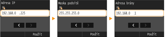 <Maska podsítě> <Adresa brány>.Zadejte nastavení pomocí číselných tlačítek a klepněte na tlačítko <Použít> na každé obrazovce.