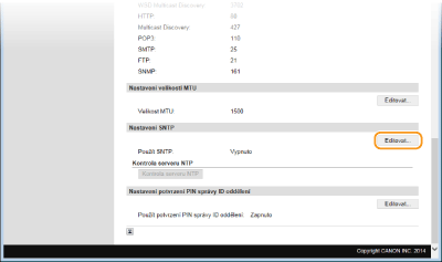 Protokol SNTP (Simple Network Time Protocol) umožňuje upravit systémové hodiny pomocí časového serveru v síti. Tento protokol se používá zpravidla k synchronizaci zařízení a serveru, například když zařízení potřebuje přístup k serveru LDAP s povoleným ověřováním zabezpečení. Čas se upravuje na základě světového času UTC, před konfigurací protokolu SNTP tedy zadejte časové pásmo (Nastavení data/času). Nastavení protokolu SNTP lze provést pomocí Vzdáleného uživatelského rozhraní.