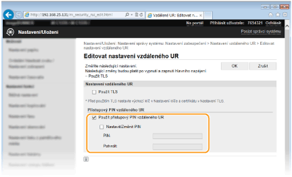 Pokud kód PIN zapomeneteZadejte nový kód PIN pro přístup ke Vzdálenému uživatelskému rozhraní v nabídce nastavení na ovládacím panelu. Proveďte na přístroji tyto operace: <Nabídka>