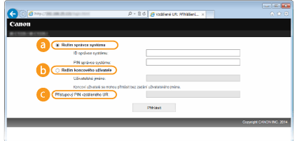 Prostřednictvím Vzdáleného uživatelského rozhraní můžete provádět všechny operace a nastavení. Zadejte příslušné ID do pole [ID správce systému] a kód PIN do pole [PIN správce systému] (