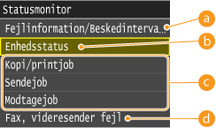 , vises en skærm, der giver dig mulighed for at kontrollere statussen for de dokumenter, der udskrives, sendes eller modtages, samt statussen for maskinen, f.eks. tonerniveauet eller oplysninger om netværksindstillinger som f.eks. maskinens IP-adresse.