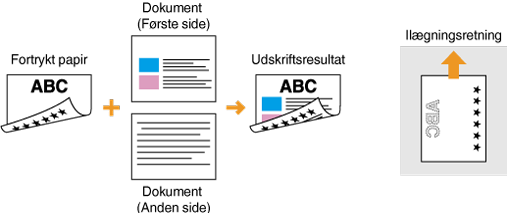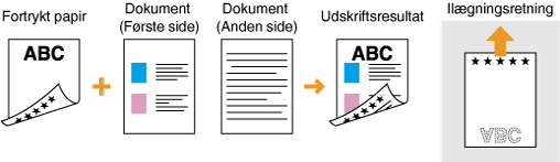 Når du udskriver på fortrykt papir, skal du ændre retningen af papiret, der skal ilægges, hver gang du udfører 1-sidet eller 2-sidet udskrivning. Men hvis <Skift papirindføringsmetode> er indstillet til <Prioritering for printside>, kan retningen, som du bruger til at ilægge fortrykt papir i til 2-sidet (med logosiden nedad), også bruges til 1-sidet udskrivning. Denne indstilling er især nyttig, hvis du ofte udfører 1-sidet og 2-sidet udskrivning. Skift papirindføringsmetode