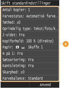 . Hvis du ændrer disse standardindstillinger, så de passer til de betjeninger, du ofte udfører, kan du undgå behovet for at konfigurere de samme indstillinger, hver gang du laver kopier.