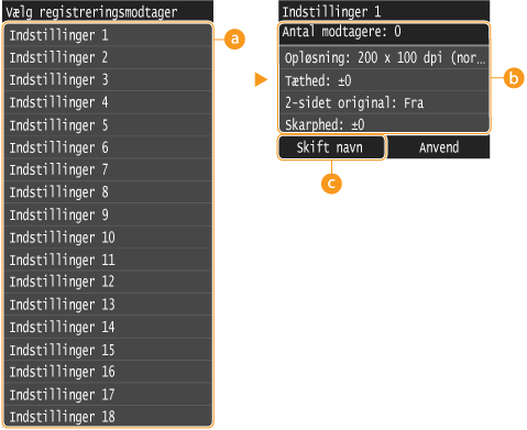 Hvis en destination, der er registreret i en indstilling, slettes fra adressebogen, slettes den også fra den registrerede indstilling.