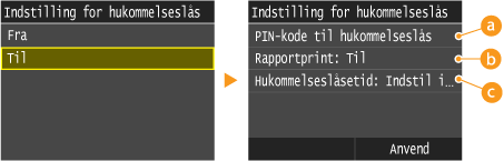 Giver dig mulighed for at registrere en adgangskode på op til syv cifre. Du kan registrere en adgangskode ved at bruge taltasterne til at indtaste en adgangskode og derefter trykke på <Anvend>. Indtast de samme cifre igen for at bekræfte, og tryk på <Anvend>. Denne adgangskode er nødvendig, når du ændrer indstillingerne for modtagelse i hukommelsen, eller når du deaktiverer funktionen Modtagelse i hukommelsen for at udskrive alle de gemte dokumenter. Hvis du ikke vil registrere en adgangskode, skal du blot trykke på <Anvend> uden at indtaste noget.