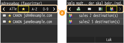 Med adressebogen kan du angive en destination ved at vælge fra en liste over registrerede destinationer eller ved at søge efter navn for destinationer med modtagernavne. Du kan også angive en destination direkte ved at indtaste et trecifret nummer (kodeopkaldsnummer), der er angivet for destinationen.