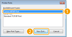 Vælg [Canon MFNP Port] (Canon MFNP-port) for [Available ports types] (Tilgængelige porttyper), og klik på [New Port] (Ny port).