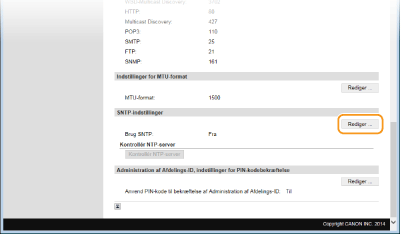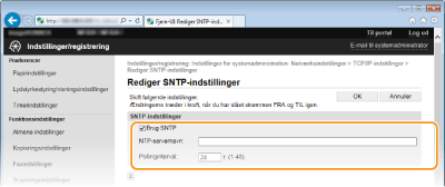 Maskinens SNTP understøtter både NTP- (version 3) og SNTP-servere (version 3 og 4).
