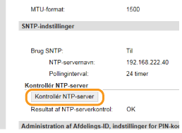 [Netværksindstillinger] [TCP/IP-indstillinger], og klik på [Kontrollér NTP-server] i [SNTP-indstillinger]. Hvis der er etableret en ordentlig forbindelse, vises resultatet, som det er angivet herunder. Bemærk, at denne handling ikke justerer systemuret.![]() |