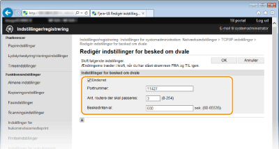 Markér afkrydsningsfeltet for at give software til styring af enheder besked, om maskinen er tændt eller slukket. Når [Underret] er valgt, kan du forvente at maskinen undgår unødvendig kommunikation i dvaletilstanden og reducere det samlede strømforbrug. [Portnummer]